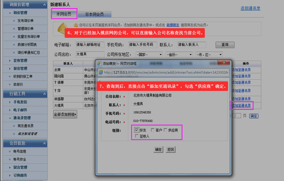 第五步:当前供应商为模房网会员时,选择本网会员,然后点击搜索,找到当前供应商,并加入到客户群组中。