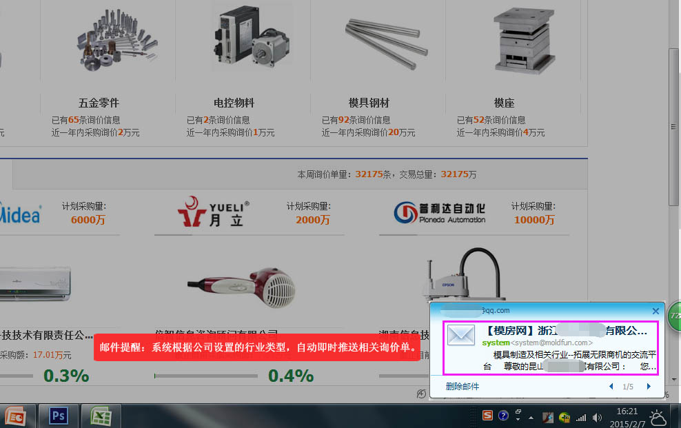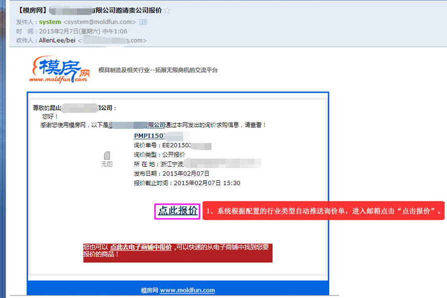 第一步:(方式一)系统根据公司设置的行业类型,自动匹配并邮件推送相关的询价单给供应商。