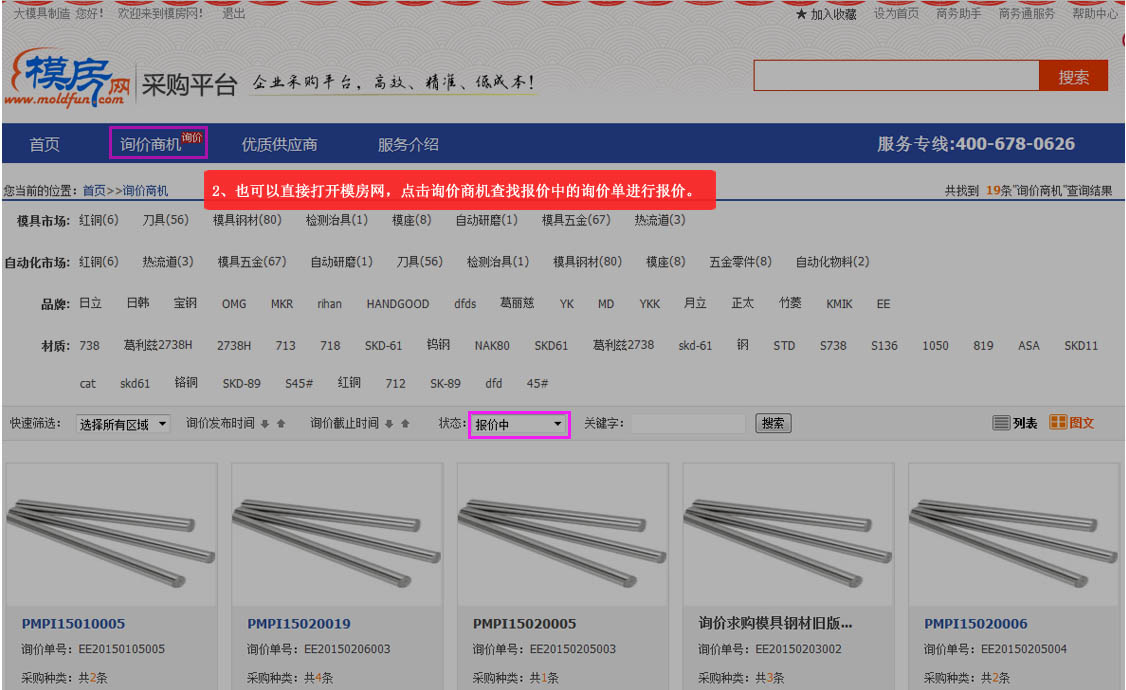第三步:(方式二)输入www.moldfun.com进入模房网,点击菜单“询价商机”进入询价商机界面,选择报价中的询价单,点击进入。