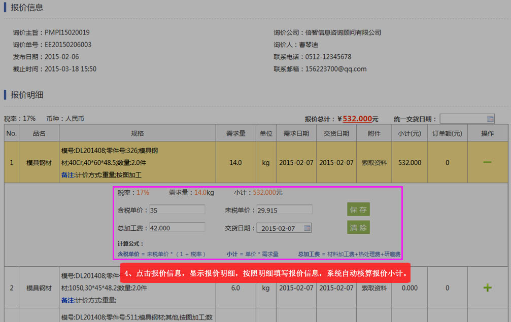 第五步:进入报价界面,点击第一条询价明细,填写单价、加工费后保存,然后点击第二条明细报价。