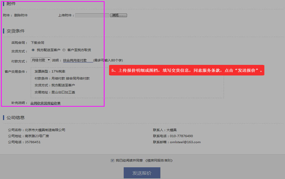 第六步:填写完所有报价明细后,填写交货方式,然后点击“发送报价”。