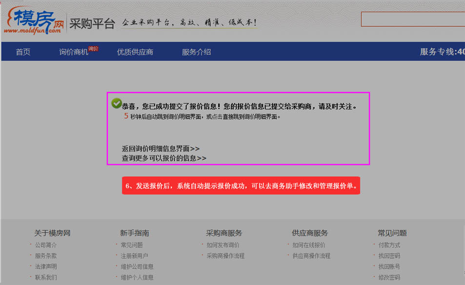 第七步:发送报价后,系统提示报价成功,可以回到询价单修改报价,也可以在商务助手查看报价。
